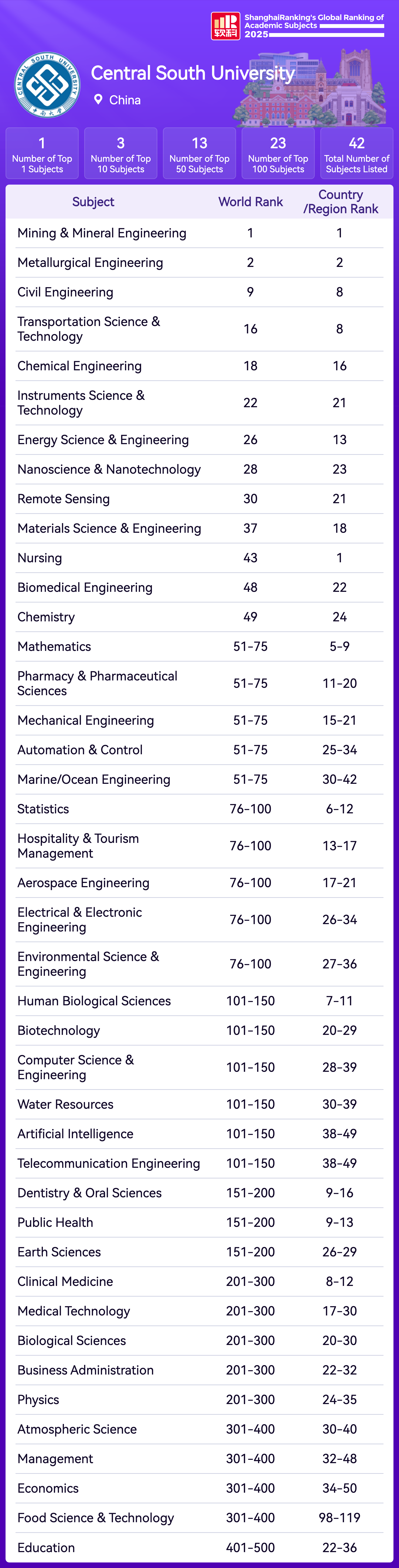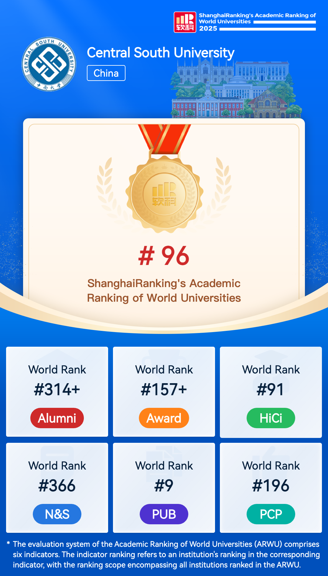 Situated in the famous historical and cultural city of Changsha, Central South University (CSU) is a comprehensive and national key university under the direct supervision of the Ministry of Education of China. The University is among the first group admitted into both Project 211, a project of building national key universities and colleges for the 21st century, and Project 985, a joint constructive project of building world-class universities co-sponsored by the Chinese central government and local governments. And it is listed among the first batch of leading universities and colleges participating in the “Initiative 2011”, a national cooperative platform for improving the innovation capability of higher education institutions in China. CSU was established in April, 2000 by merging three separate universities: Hunan Medical University (HMU), Changsha Railway University (CRU), and Central South University of Technology (CSUT). The former CSUT develops from Central South College of Mining and Metallurgy established in 1952.CRU originates from Central South College of Civil Engineering and Architecture founded in 1953. Both CSUT and CRU rooted their main disciplines in the mining and road engineering areas of Hunan Higher Industrial School established in 1903. HMU dates its history back to Xiangya Medical College, which was created in 1914 and is one of the earliest colleges of western medicine inChina. CSU covers 12 fields of study, including engineering, science, medicine, literature, law, economics, management, philosophy, education, history, agriculture and Arts. It owns comprehensive discipline systems for nonferrous metals, medical science and rail transportation, etc. CSU also owns many national key disciplines, including 6 national key first-level disciplines and 12 national key second-level disciplines, 59 national key clinical specialties. The University offers 94 undergraduate programs, 58 master programs (first-level disciplines),33 doctoral programs (first-level disciplines) and 31 post-doctoral research stations. There are 7 disciplines whose ESI ranking is among global top 1%, namely, Materials Science, Engineering, Clinical Medicine, Chemistry, Pharmacology and Toxicology, Biology and Biochemistry and Neuroscience and Behavioral Science. Besides, CSU boasts 6 affiliated hospitals, including 3 Xiangya hospitals (with widespread reputation), Xiangya Stomatology Hospital, The Affiliated Hospital of Xiangya School of Medicine and Haikou Hospital. CSU gathers many prominent scholars and professors, about 1400 of whom are professors or have senior titles, more than 1000 are tutors of postgraduate candidates, about 44 are experts from the “1000-elite Program”, 15 are members of Chinese Academy of Engineering and 2 are members of Chinese Academy of Sciences. There are over 53,000 students in total, including more than 33,000 undergraduate students, over19,000 master and PhD candidates and almost 1000 international students and students from Hong Kong, Macau andTaiwan. CSU is the pilot university for the “Excellent Talents Initiative” of Ministry of Education, which is designed to educate and train talented engineers, doctors and law practitioners forChina. CSU is one of the first group of pilot universities offering 8-year medical education program (Doctor of Medicine) and also is the first university offering master programs for training military officers by integrating their military and professional skills. In recent years, for Undergraduate Teaching Assessment, CSU is highly rated by Ministry of Education and has been invited to share its experience in solving graduates’ employment. As a result, CSU is one of the top 10 most welcomed universities and colleges by the employers inChina. The University currently owns 16 national innovation platforms, including 3 national key laboratories, 4 national engineering research centers, 4 national engineering laboratories, 2 national engineering technology research centers, 1 national clinical research center, 1 defense science and technology laboratory, 1 national engineering and innovation capacity promoting platform. Since 2000, CSU has has won 78 awards out of three national major award categories for science and technology, including 9 first and grand prizes and 8 programs listed in the “Top 10 Science and Technology Progress in Universities and Colleges”. The University has established long-term contacts and cooperative relationships with over 200 colleges and universities as well as research institutions from 20 countries and regions. At present, international students coming from more than 80 countries and regions are studying in CSU. Central South University now is striving to build itself as a high-level, world-renowned and characterized research university, and to make greater contribution to the realization of Chinese Dream.
