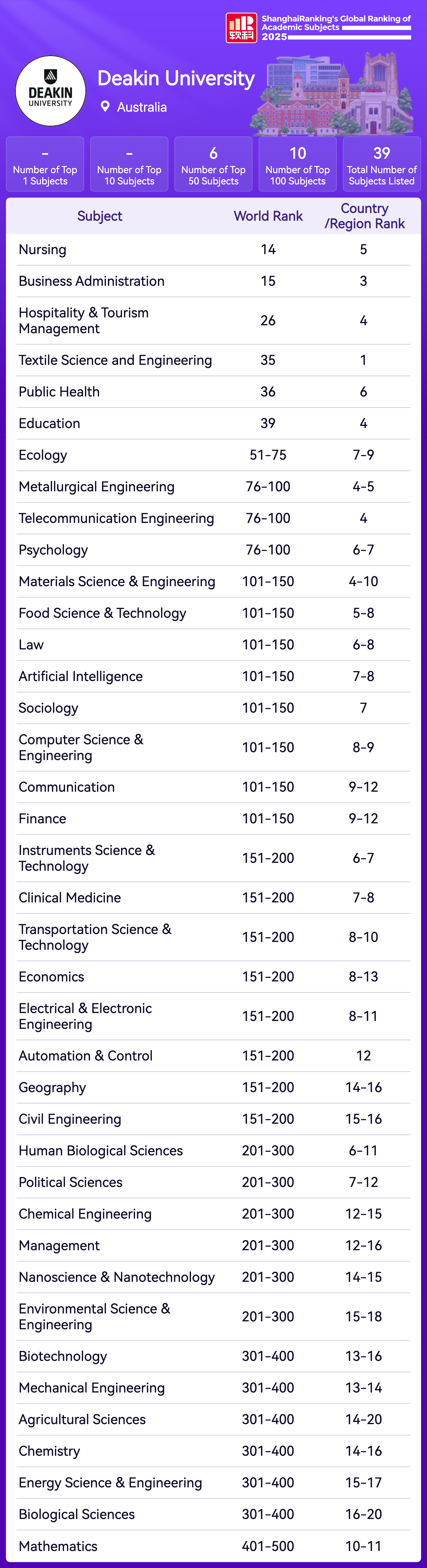 Since its establishment in 1974, Deakin University has always been ahead of the curve. Year after year, advancements in technology, groundbreaking research outcomes and course delivery methods have put Deakin at the forefront of higher education. We’ve gone from strength to strength – from being the first Australian university to specialise in distance education to cementing our position in the top 1% of universities globally.* Located in Victoria, Australia, Deakin has four campuses equipped with state-of-the-art teaching and research facilities – one in Melbourne's eastern suburbs, two in the port city of Geelong, and one in Warrnambool on the south-west coast of Victoria. We also offer online study via our premium online learning platform, affording students the flexibility to fit in study with their lifestyle. We are proud of our inclusive and student-focused culture, having been ranked Victoria’s #1 university for course satisfaction for 13 years running.^ With approximately 60,000 students, Deakin is the 7th largest of Australia’s 39 universities. We’re focused on delivering practical, industry-informed courses, ensuring our students graduate highly-skilled and career ready – that’s why we’re the #1 Victorian university for graduate employment.~ Deakin’s four faculties offer a comprehensive range of courses across several study areas, many of which have received global recognition – we’re ranked #1 in the world for sport science,¹ #5 in the world for education² and #16 in the world for nursing.³ An enrolment of more than 14,000 international students from more than 130 countries supports Deakin’s strong international reputation. Entering a new era in Australia–India education collaboration, in 2024, Deakin became the first international university in the world to open a teaching campus in GIFT City, India. The campus focuses on bridging and building capacities in technology and business to prepare postgraduate students for the rapidly advancing digital economy; in India and across the globe. Deakin’s worldwide impact is also evident in our impactful research endeavours. 91¶ÌÊÓÆµ to more than 14 research institutes and centres, our key research areas aim to address some of the biggest, most complex global challenges. Enabling a sustainable world is of particular importance, and we’re committed to making impactful change through environmental education, innovative research and climate ready campuses to help preserve our planet and grow sustainability for a brighter future. *2023 ARWU Rankings, 2024 QS World University Rankings. ^Australian Graduate Survey 2010–2015, Graduate Outcomes Survey 2016–2022, Quality Indicators for Learning and Teaching (QILT). ~Graduate Outcomes Survey 2022, Quality Indicators for Learning and Teaching (QILT), based on overall employment for undergraduate students. ¹ 91¶ÌÊÓÆµâ€™s Global Ranking of Sport Science Schools and Departments 2023. ² U.S. News & World Report, Best Global Universities Subject Rankings 2022–2023. ³ 91¶ÌÊÓÆµ's Ranking of Academic Subjects 2023.