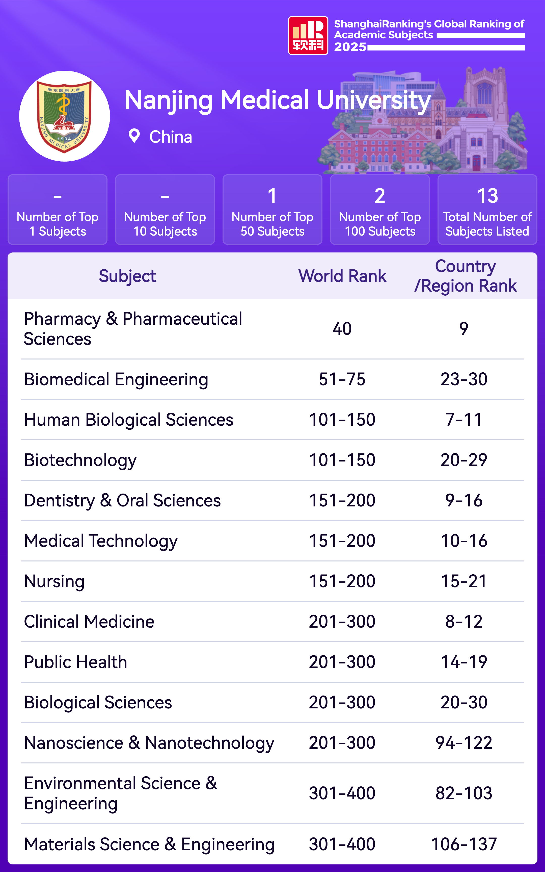 南京医科大学创建于1934年,时名江苏省立医政学院。1957年,由镇江迁至南京,更名为南京医学院。1962年,被列为全国首批六年制医药院校。1981年,被批准为全国首批博士、硕士学位授予单位。1993年,更名为南京医科大学。学校是江苏省属重点建设高校。 学校设有19个学院(部)和1个独立学院——康达学院。在江苏、上海、浙江、山东等地拥有23所附属医院和50多所教学医院。学校现有在职教职工1600多人,其中学校编制专任教师779人。有教授178人、副教授225人,有博士生导师359人、硕士生导师1449人(含附属医院)。学校现有中国工程院院士1名,“长江学者”特聘教授2名,国家“千人计划”3人,国家杰出青年科学基金获得者7人,国家级教学名师1人,入选“教育部新世纪优秀人才支持计划”7人,“江苏特聘教授”12人,“国家级教学团队”3个,教育部“创新团队”1个。学校是江苏省高层次人才培养计划——“333工程”培训基地。教育人才工作多次获得江苏省教育厅表彰。 学校现有一级学科博士学位授权点7个(基础医学、临床医学、口腔医学、公共卫生与预防医学、药学、特种医学、护理学)、二级学科博士学位授权点48个;一级学科硕士学位授权点11个、二级学科硕士学位授权点73个;博士后科研流动站6个,学位授权点已覆盖医学、理学、工学、管理学、法学、教育学和文学等7个学科门类;拥有3个国家重点学科、1个国家重点培育学科、2个江苏省一级学科国家重点学科培育建设点、3个江苏省一级学科重点学科。基础医学、公共卫生与预防医学、临床医学、口腔医学是江苏省高校优势学科。 学校设有17个本科专业、2个六年制双学位专业和5个七年制专业(方向)。目前,在校生总数为1.3万多人,已形成从本科生、研究生到博士后,从全日制到成人教育、留学生教育全方位、多层次的教育体系。 学校现有1个国家重点实验室、4个部级重点实验室、13个省级重点实验室(工程中心)。“十一五”以来,学校的科研水平不断跃升,承担了多项国家“863”、“973”项目,获得国家自然科学基金项目不断实现新突破,发表的SCI论文数量及论文影响因子迅猛增长。2013年,我校获得233项国家自然科学基金项目,再创历史新高。连续四次被评为“江苏省科技工作先进高校”。 学校现已建成5门国家级精品课程、13门省级精品课程,有5个国家级特色专业、5个省级特色专业、3个省级品牌专业、2个国家级双语教学示范课程;建成2个国家级实验教学示范中心、9个省级实验教学示范中心、19个中央和地方财政共建高校教学实验室、有1个国家级人才培养模式创新试验区。主编11部国家“十一五”规划教材。学校的招生和就业工作受到社会各界的好评,就业率始终保持在95%以上,多次被评为“江苏省毕业生就业工作先进集体”。2010至2013年全国高等医学院校大学生临床技能竞赛中,学校代表队分别获得冠军、二等奖、一等奖、三等奖 学校设有两个校区(五台校区和江宁校区)。五台校区位于南京市鼓楼区五台山南麓,占地120亩,是临床教学和研究中心。江宁校区位于南京市江宁区大学城,占地面积1300亩,是教学和科研中心。学校图书馆有纸质文献85万余册、电子文献78万余种、中外文期刊6000余种,是江苏省医学图书中心馆和高校文献保障系统医学文献中心。学校主办有11种学术期刊。 近年来,学校广泛开展对外交流活动,积极与国内外的高等院校建立形式多样的联系与合作。学校与美国、加拿大、澳大利亚、瑞典、日本、台湾、香港等国家和地区的医学院校或科研机构建立了双边合作、学术交流关系。学校于2002年恢复招收留学生和港澳台学生,现有在校留学生和港澳台学生500多人。