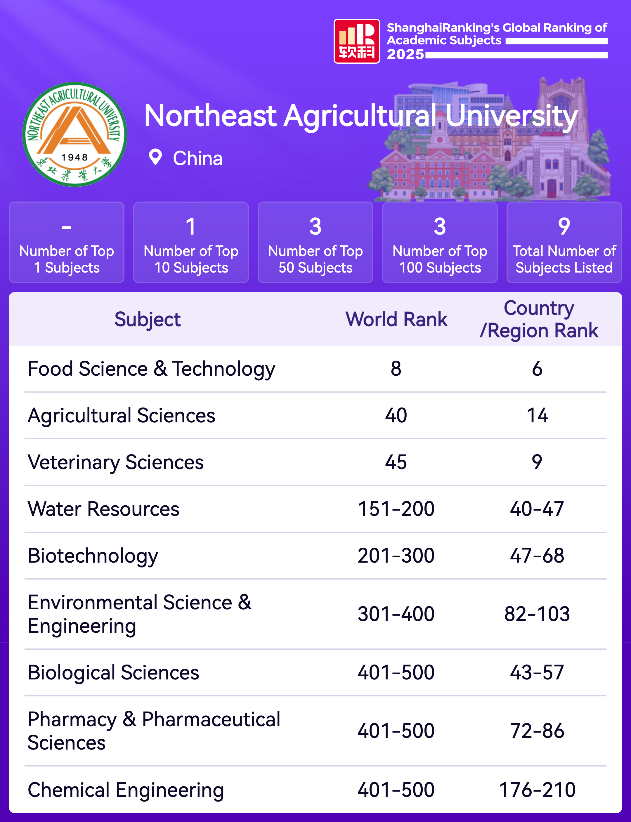 Northeast Agricultural University, founded in Harbin in 1948 and originally named Northeast Agricultural College, is a key university directly under Heilongjiang province and one of universities of Project “211”. It is located in No.59 Mucai Street, XiangFang District, Harbin. NEAU comprises 18 colleges and 1 Education Department, covering the disciplines of Agronomy, Engineering, Science, Economics and Management. There are 3 key disciplines of national level, 3 key (under cultivation) disciplines of national level, 2 key disciplines under the Agricultural Ministry, 2 key disciplines of provincial level, 6 first-class provincial key disciplines and 29 second–class ones. NEAU is entitled to verify the proficiency of the professors, associate professors and PhD tutors. It has a balanced teaching structure and relatively high overall teaching level with 1097 full-time teachers, among which there are 195 professors and 256 associate professors, and 418 have Master’s Degree and 326 own Doctoral Degree. Among the teachers, one is Academician of Chinese Academy of Engineering, and one of them was awarded “HeLiangHeLi Fund” prize for progress in Science and Technology. There are 1 national outstanding teacher, 8 “Longjiang Scholars” engaged professors, 3 guest professors, 13 teachers awarded HuoYingDong Teacher Fund and Youth Teacher Prize, 3 nominated teachers as experts making outstanding contributions and 161 PhD tutors. Undergraduate education is considered by NEAU as the base of the university and postgraduate education as the road to the stronger university. It is among those first authorized to establish centers for the Bachelor’s, Master’s and Doctoral Degrees. NEAU has the comprehensive education system with 72 undergraduate majors, 8 doctorial degree-conferring bodies of first level, 31 Doctoral Degree Programs, 61 Master's Degree Programs,7 post-doctoral research stations. Russian training center was founded in agricultural center and one science basic research and talent teaching basement under the Ministry of Education. The student enrollment of NEAU is 19071, among which there are 3061 postgraduates, 15873 undergraduates, 137 international students. So far, over 80,000 students have been produced. The university is excellent in scientific research conditions and strengths with 2 research centers of national level, 9 research centers of provincial level, 17 key laboratories of provincial level. Up till now, over 300 research projects have been awarded by various provincial departments and national departments, among which there are 26 awards of National Prize for Natural Sciences, National Invention Prize and National Prize for Progress in Science and Technology. The university has extensive academic exchanges with foreign countries. It has drawn up cooperative exchange programs with 52 universities and colleges in Russia, Japan, Korea, America, Canada, Australia and Ireland. It is one of the first universities which established academic relations with colleges in Russia. The campus covers an area of 3.689 million square meters, with a total floor space of over 826.4 thousand square meters. Teaching and research equipment value RMB 236 million . The library has a collection of over 1.6929 million volumes, among which there are 659.9 thousand electronic books. Long-distance education started in 2000 with the permission of the Education Ministry. It is the only one local university of the first 31 pilots all over the nation. It publishes many journals such as NEAU Journal (Natural Science version) (Social Science version) (English edition), China Potatoes, Fodder Readings, Dairy Industry of China, Dairy and Human, Research on Fishing Economics and Soybean Technology. NEAU is striving to be an international famous and first-level university of the same kind in China and a multi-disciplinary, researching and teaching and open university with the characteristics of modern agriculture of the North China.