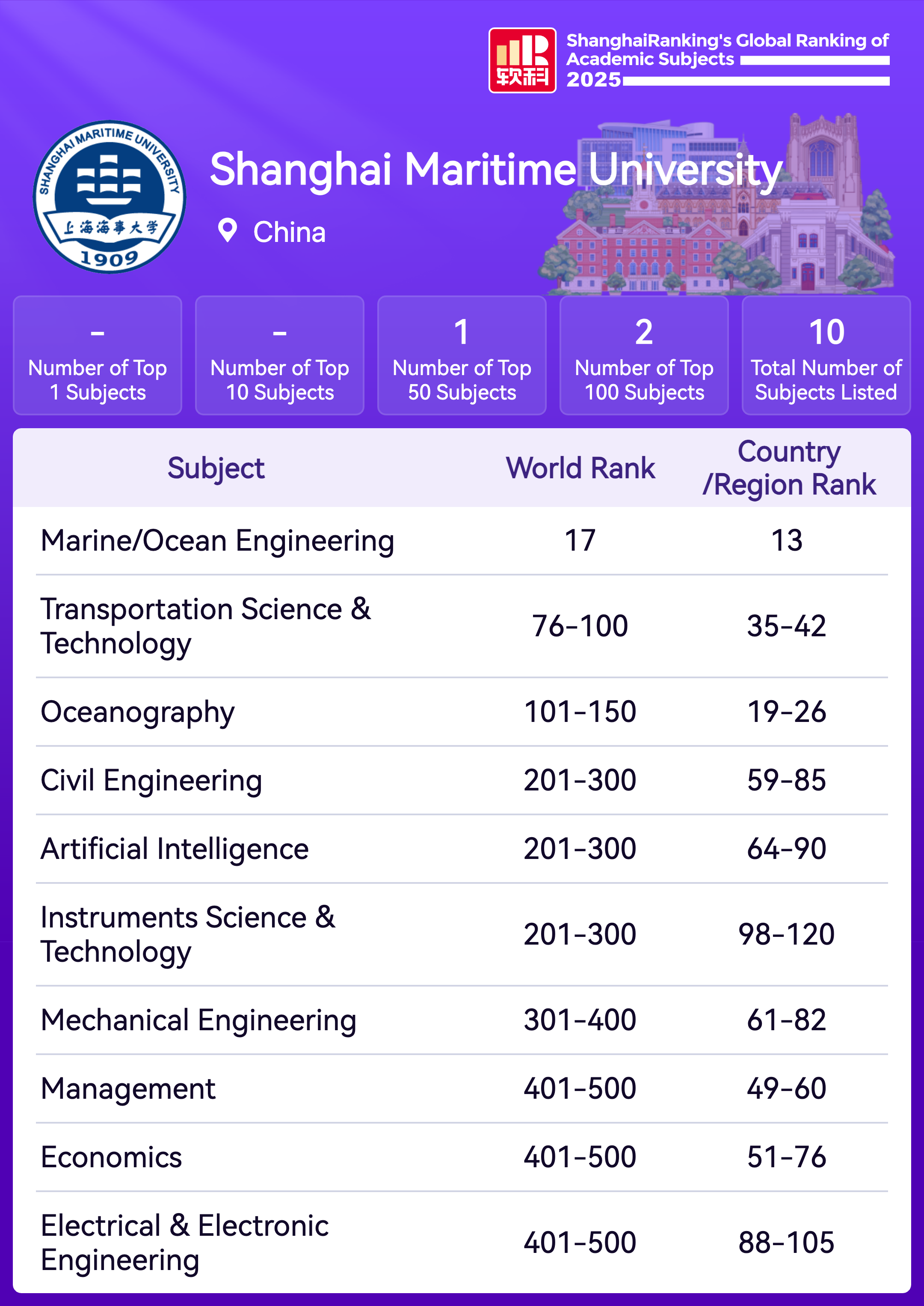 At present the university runs 2 post-doctoral research stations, 19 doctoral programs, 59 master’s degree programs, 45 bachelor’s degree programs, and 10 associate degree programs. SMU boasts 10 provincial and municipal key research institutes and laboratories, 1 state-level key discipline, 5 state-level specialties with special features, 9 ministerial or municipal key disciplines, and 17 Shanghai municipal “educational heights”. SMU owns an aquatic training center, the Yufeng Ship, a 10-thousand-ton container ship for teaching and internship training, and a newly-built 48-thousand-ton Yangtze handymax bulk carrier for teaching and internship training ship, named Yuming ship.