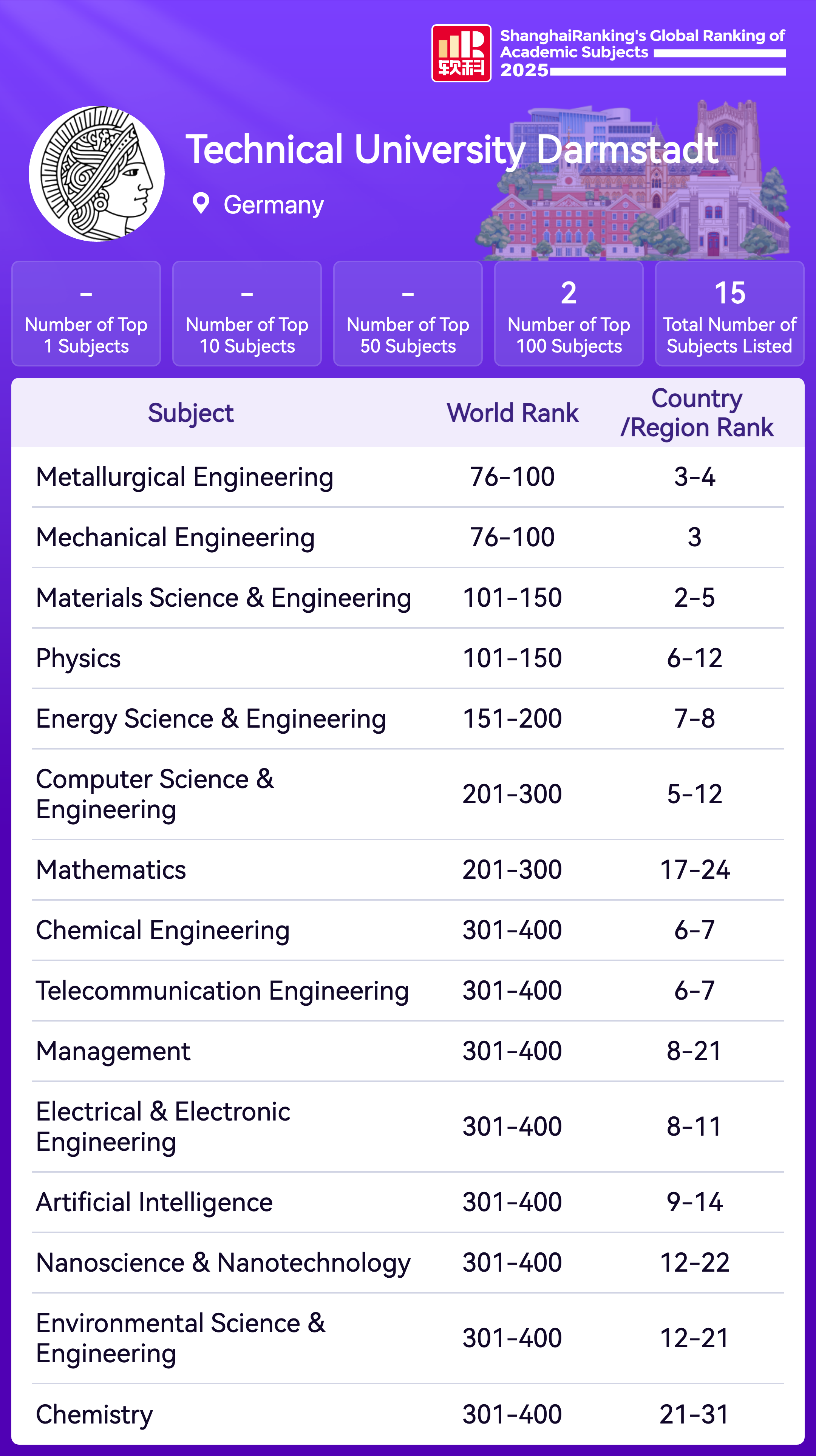 TU Darmstadt is one of Germany’s leading technical universities and a synonym for excellent, relevant research. Global transformations – from the energy transition via Industry 4.0 to artificial intelligence – are challenges TU Darmstadt embraces wholeheartedly. We are crucially shaping these far-reaching processes of change with outstanding insights and forward-looking study opportunities.TU Darmstadt pools its cutting-edge research in three fields: Energy and Environment, Information and Intelligence, Matter and Materials. Our problem-based interdisciplinarity involving the engineering sciences, natural sciences, humanities and social sciences as well as our productive interaction with society, business and politics generate progress towards sustainable development worldwide.Since we were founded in 1877, we have been one of Germany’s most international universities; as a European technical university, we are a driving force in developing a trans-European campus together with universities from seven European countries in the network, Unite! Our home is the metropolitan region Frankfurt-Rhine-Main. With our partners in the alliance of Rhine-Main universities – Goethe University Frankfurt and Johannes Gutenberg University Mainz – we further the development of this globally attractive science location.