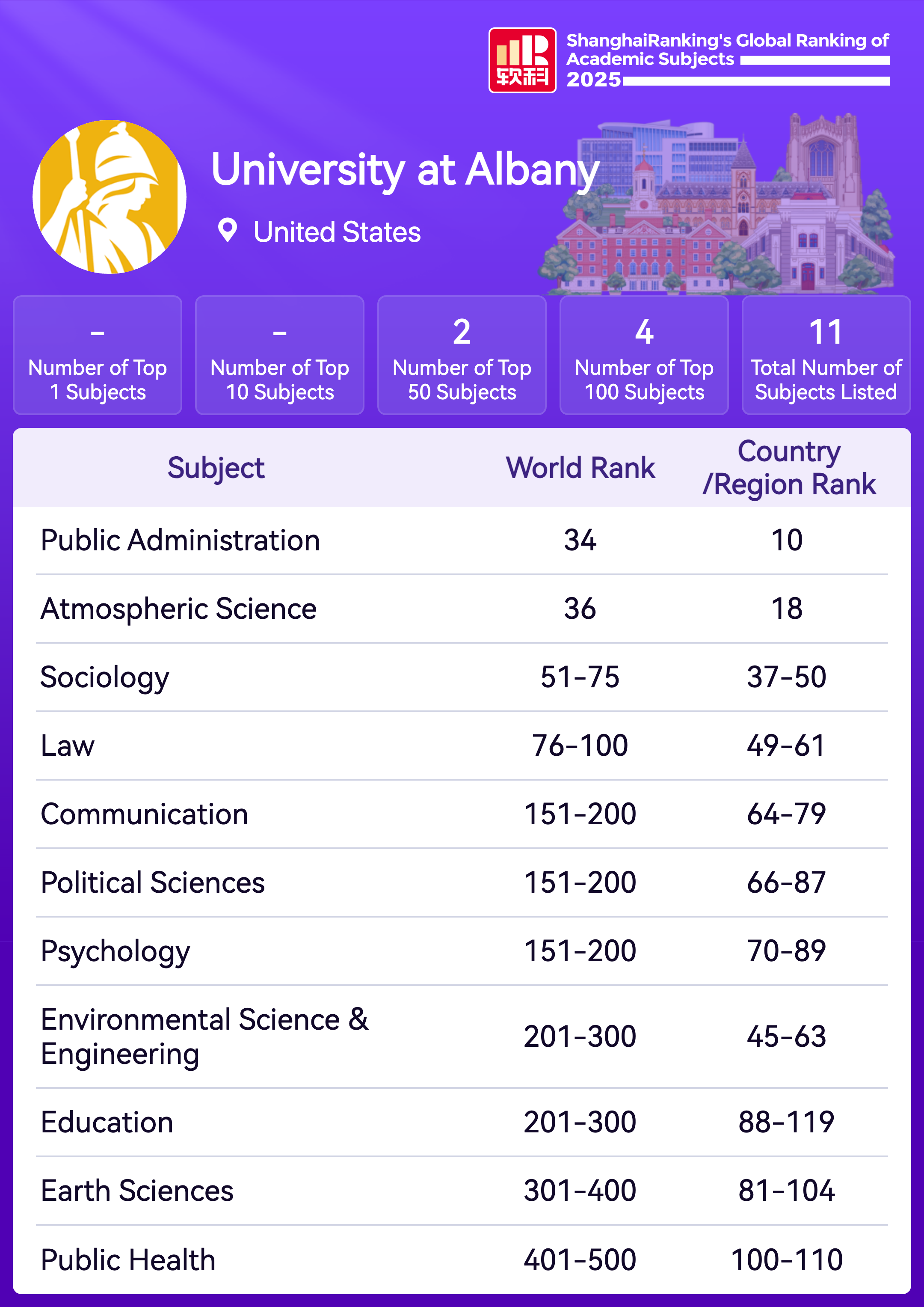 Strategically located in the state capital of New York, the University at Albany is an internationally recognized public research institution that brings "The World Within Reach" to more than 17,300 students at the graduate and undergraduate levels. The varied perspectives and life experiences of a student body and faculty that represent more than 100 nations provide a diversity that enriches learning at UAlbany. UAlbany students can choose from 118 undergraduate majors and minors and 114 graduate programs. Many of these programs are nationally ranked, among them criminal justice, information science, public administration, social welfare and sociology. Leading USA program rankings in 2014 include MBA programs leading to jobs: #1, Criminal Justice: #2, Reading: #2, Information Technology and Management: #3, African Studies: #3, Social Welfare: #5 (US News, Best Colleges, 2014).