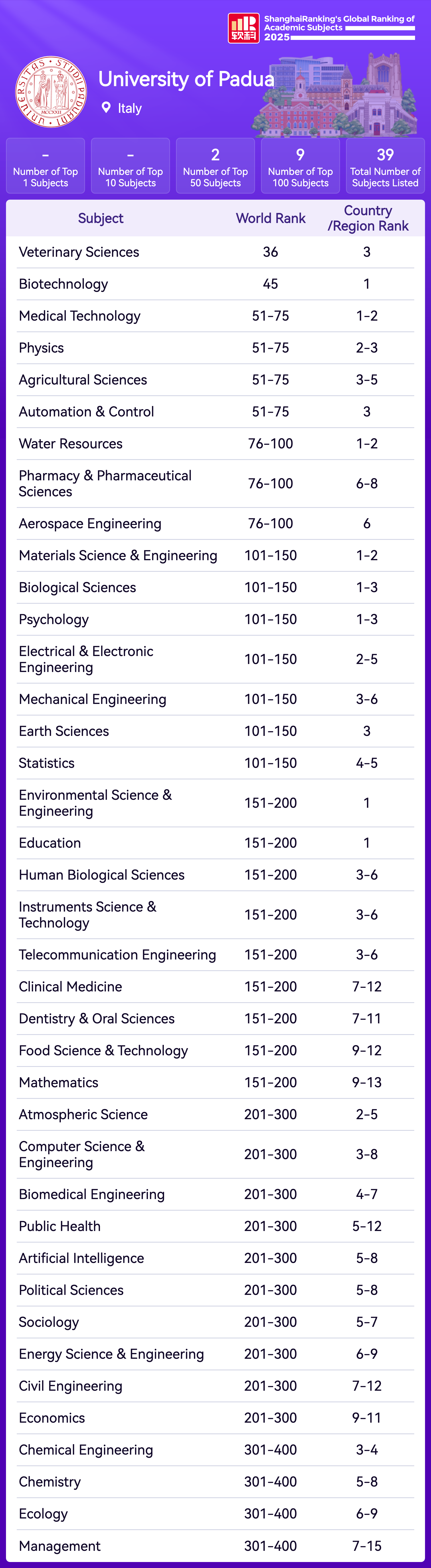 Along with such universities as Bologna, Paris, Oxford and Cambridge, that of Padua was one of the first to exemplify the idea of a Gymnasium Omnium Disciplinarum - an educational model that can now be seen throughout the world. Though the university's year of foundation is generally given as 1222, that in fact only marks the date from which there are records of a "fixed and publicly recognised university established within the city" and so the actual foundation can be dated even early, to a period when a number of professors and students had left the University of Bologna as a result of "offences to academic freedom and the failure to observe the privileges that had been guaranteed to teachers and pupils". Such exchanges of personnel and students - together with the similarities in the Statutes of the two foundations - reveal that Padua placed a certain importance on this link with what was the oldest university in the world, against which it was however very soon setting itself up as a rival (and even centuries later that rivalry has lost none of its edge).University of Padua was not founded as the result of a charter granted by pope of emperor, but as a "response to the specific social and cultural conditions that created a need for it"; and its motto of Universa Universis Patavina Libertas was well-deserved not only under the original Commune of the thirteenth century but also during the fourteenth-century rule of the Carraresi and throughout the period of Venetian rule of the city (from the 15th to the 18th century), all these different authorities guaranteeing full respect for the university's freedoms. The fifteenth century would see the beginning of more than three hundred years of growth in prestige as the University of Padua benefited from the protection of the Venetian 2 Republic, which was determined that this should be the only Gymnasium Omnium Disciplinarum within its territories. It was during this period that Padua made its great contribution to the nascent scientific revolution, with developments in philosophical thought, in the study of medicine and anatomy and the great discoveries in astronomy, physics and mathematics that are linked with the eighteen-year period that Galileo Galilei taught at the university (from 1592 to 1610).During the seventeenth and eighteenth century, as universities spread throughout Europe and ideas were exchanged backwards and forwards across the continent, the role of Padua University changed; however, it still maintained its unique position within the Venetian Republic, and the eminence of its professors meant it continued to hold a high place both within and without Italy. Amongst the figures associated with the University at this time, one might mention: Domenico Guglielmi, Bernardino Ramazzini, Gian Battista Morgagni, Gian Battista Poleni, Antonio Vallisneri and Giuseppe Toaldo, with the students including Carlo Goldoni, Ugo Foscolo, Giuseppe Tartini and Giacomo Casanova.The political role of the university was particularly apparent in the nineteenth century, when its professors and students took part in the local uprising of February 1848 against the Austrian occupation; and again in the First World War, Padua would find itself the centre of the zone of operations bordering on the Austrian Front. Just a few decades later, under its Rector Concetto Marchesi and its Pro-Rector Egidio Meneghetti, Padua University would live up to its motto by taking a leading role in the struggle against the Nazi occupation of 1943-45; and in recognition of the sacrifices made by so many young people who lost their life in that struggle, the university would later receive the Gold Medal for Valour, the only university in Italy to gain such an awardn recent years, the University has been able to meet the problems posed by overcrowded facilities by re-deploying over the Veneto as a whole. In 1990, the Institute of Management Engineering was set up in Vicenza; then the summer courses at Bressanone began once more; and in 1995 the Agripolis centre at Legnaro - for Agricultural Science and Veterinary Medicine - opened. Other sites of re-deployment are at Rovigo, Treviso, Feltre, Castelfranco Veneto, Conegliano, Chioggia and Asiago.Recent changes in state legislation have also opened the way to greater autonomy for Italian universities, and in 1995 Padua adopted a Statute that gave it greater independence. As the publications of innumerable conferences and congresses show, the modern-day University of Padua plays an important role in scholarly and scientific research at both a European and world level. True to its origins, this is the direction in which the Institution intends to move in the future, establishing closer and closer links of co-operation and exchange with all the world's major research universities.